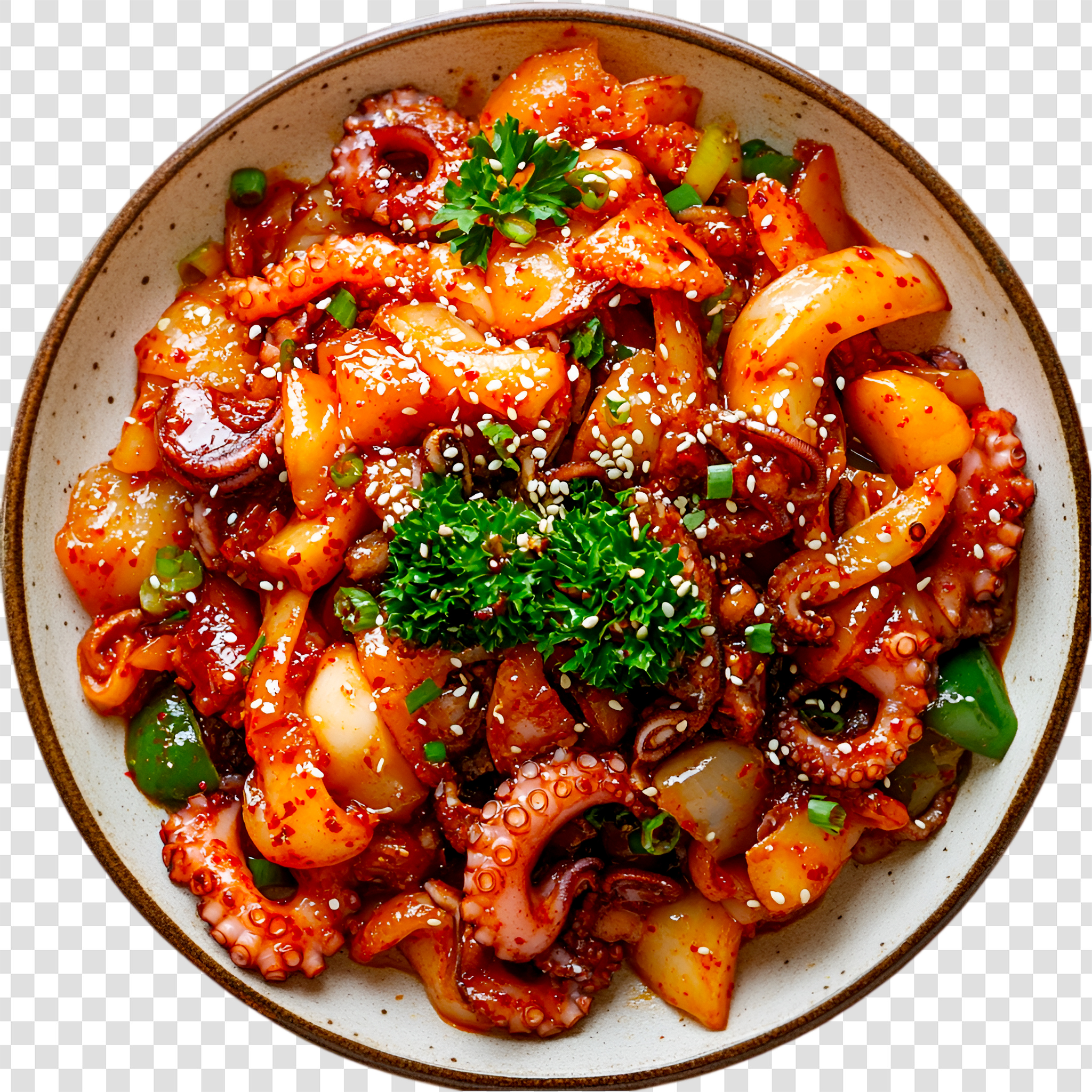 - 센 불에서 기름을 두르고 양파와 대파를 먼저 볶은 후, 주꾸미와 양념장을 넣고 빠르게 볶아줍니다.